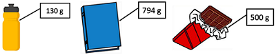 The weight of 3 different objects is given as below. How much will a basket weigh if it has 3 bottles, 2 books and 6 chocolate? ![]() |